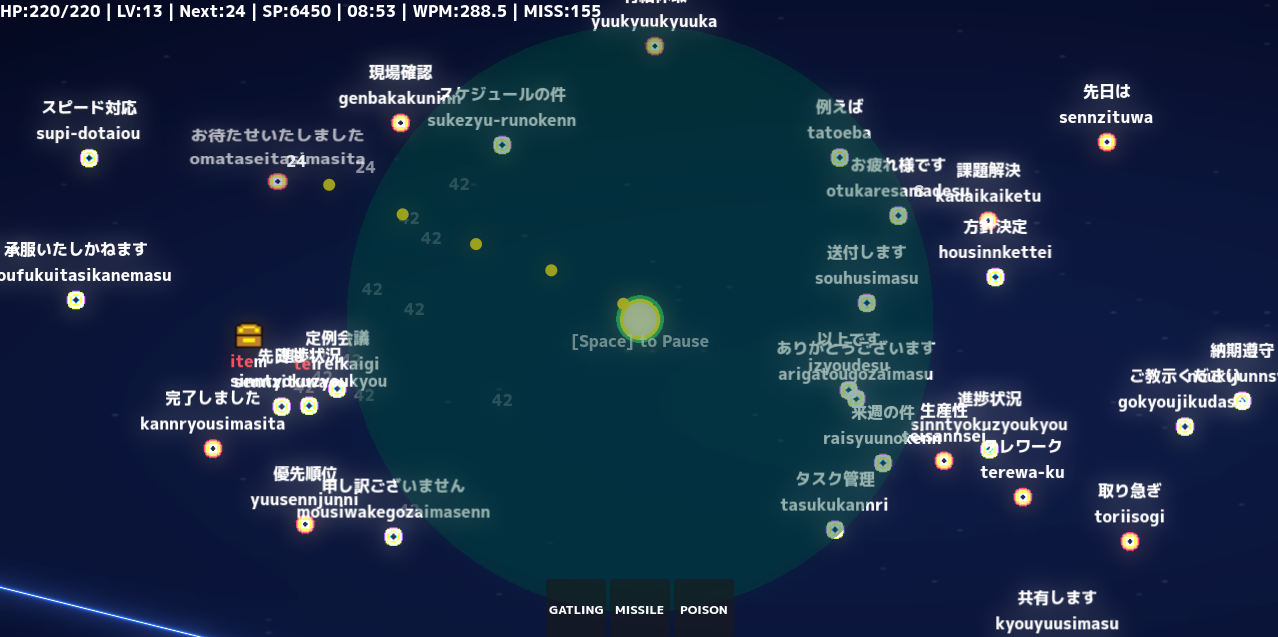 表示される文字をタイピングして敵を倒していく、タイピングシューティングです。